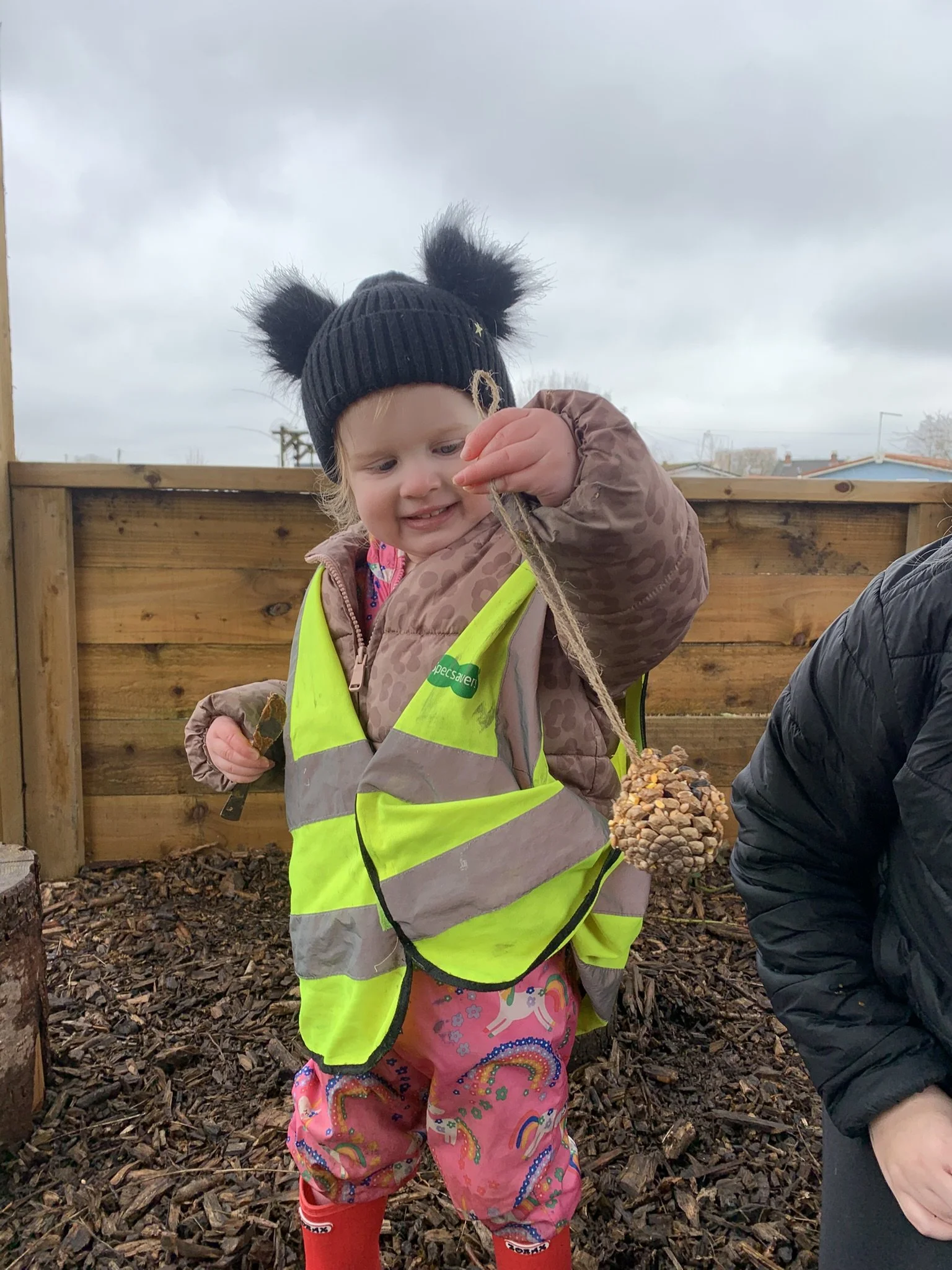 Each visit offers a range of exciting activities. The children enjoy using the balance beams, digging in the soil, rolling tyres and, more recently, making bird feeders. They carefully spread almond butter onto pine cones to create a sticky surface, then dipped them into bird seed. Every child had the opportunity to hang their bird feeder on a tree, proudly contributing to supporting local wildlife.